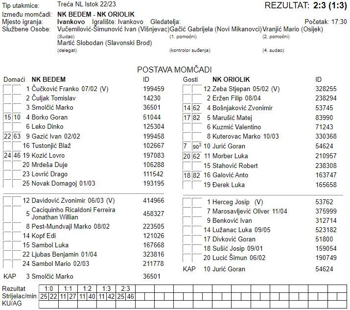 Briljantna partija Luke Morbera slomila je Bedem i koštala Stjepana Kvesića trenerske pozicije u Ivankovu. Krenulo je dobro po Bedem, u 22. minuti bolju igru je golom okrunio Domagoj Novak, no onda kreće show krilnog napadača Oriolika koji od 27. do 42. minute postiže hattrick. Odličan je bio i Novak koji svojim drugim golom u prvoj minuti nastavka smanjuje zaostatak Bedema, no svi napori domaćina do kraja su ostali uzaludni, Zeba i ekipa iz obrane odradili su posao na pravi način i kapetanu Hercegu za rođendan poklonili tri gostujuća boda.