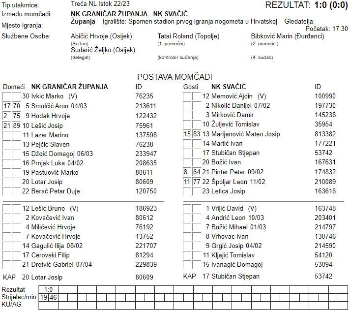 Rasterećeni gosti su propisno namučili ponovno vodeću momčad lige i ne bi bilo nimalo nezasluženo da su se kući vratili barem s jednim bodom. Potpuno je to očekivano, Svačić je momčad s vrlo kvalitetnim pojedincima koja je serijom dobrih rezultata osigurala ostanak i sada je opasan protivnik za sve. Ipak, Graničar je odradio šampionski posao, u teškoj utakmici golom Marka Pastuovića na samom otvaranju drugog poluvremena osvojili su velike bodove u borbi za naslov prvaka i ponovno su dva koraka ispred Slavonije.