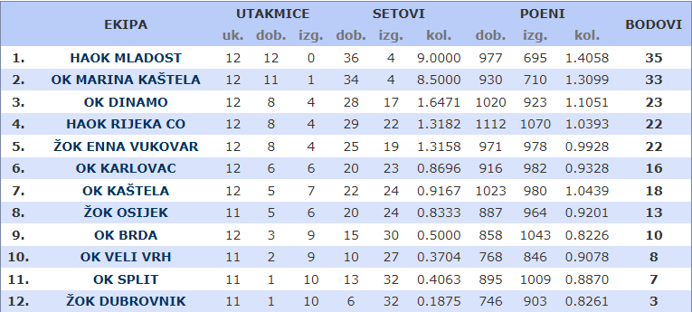 Ovaj poraz donio je pad na tablici pa su odbojkašice Vukovara trenutno petoplasirana ekipa Superlige sa 22 boda iz 12 odigranih kola, ali i s jednakim brojem bodova kao četvrtoplasirana ekipa Rijeke te samo bod manje od trećeplasiranog Dinama. Upravo je Rijeka sljedeći protivnik Vukovara pa je to prilika da se preskoče Riječanke na prvenstvenoj ljestvici.