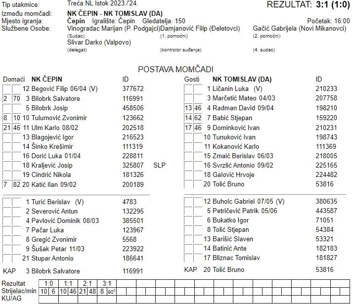 Nogomet je baš kurvanjska igra, zanimljiv je jer je strašno nepredvidiv. Tko je mogao očekivati da će Čepin tek u sedmom kolu doći do prve domaće pobjede? A eto dogodilo se, Tomislav je prvi koji se Kraj uljare nije osladio barem bodom. Prvo poluvrijeme krenulo je sjajno za domaće, nakon samo šest minuta Zvonimir Tulumović donio im je prednost koju su uspješno obranili do poluvremena. Drugo kreće sjajno po goste, Ivan Tunuković je trebao samo minutu da vrati stvari na početak. Poveselili su se gosti, no ne zadugo jer već u 48. minuti ponovno Čepin ima vodstvo koje je potpisao Antonio Stupar. Ušlo se tako u otvorenu završnicu, gosti su bili u minusu a sa stvari budu još gore po njih pobrinuo se Antonio Svrzlić koji je u prosto proširenoj rečenici upućenoj drugoj pomoćnoj sutkinji, u kojoj ipak više dominira prosto, povezao ženski spolni organ, ženskog roditelja i žensku životinju koja daje mlijeko i nalazi se u ljubičastoj boji na švicarskoj čokoladi. Zbog te verbalne vratolomije će sljedećeg vikenda uživati u slobodnim danima. A s igračem više Čepin je u petoj minuti preko svog najboljeg pojedinca Zvonimira Gregića došao i do trećeg pogotka i potvrde vrijedne pobjede.