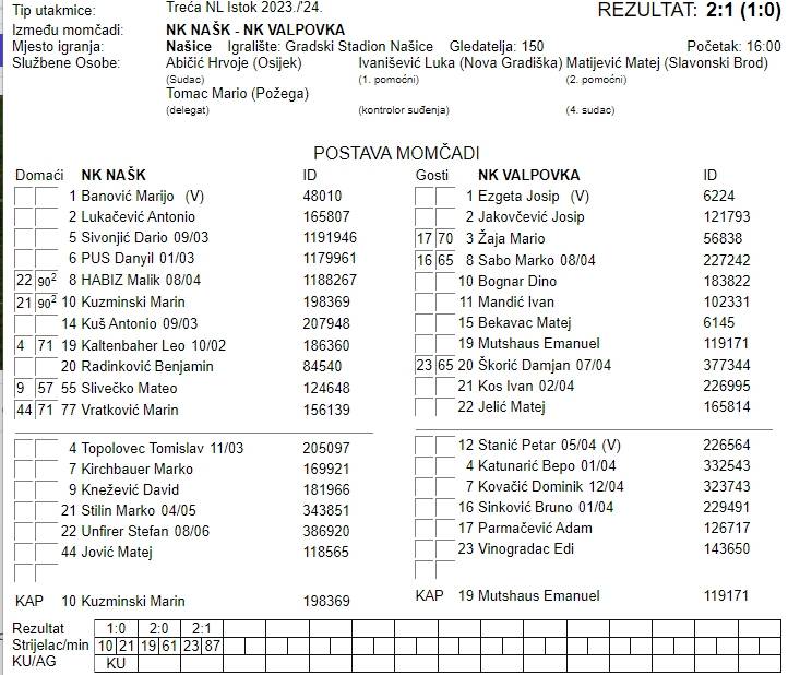 Našk je nastavio sa svojim odličnim rezultatima u rujnu, od 12 mogućih pokupili su deset bodova, sigurni smo da bi Žigić iste sekunde potpisao da listopad bude jednako učinkovit. Serija Valpovke od tri uzastopna slavlja je stala, no Zeleni isto tako mogu biti zadovoljni sa učinkom u rujnu. Našičani su poveli golom Marina Kuzminskog s bijele točke u 21. minuti, u 61. na 2:0 je dignuo Leo Kaltenbaher, dok je nadu Valpovčanima probudio Edi Vinogradac u 87; no do kraja su mreže mirovale pa su bodovi ostali u Našicama.