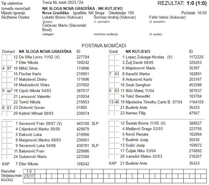 Nema kraja mukama po Kutjevu, novi poraz ostavlja ih u nezavidnoj situaciji, jedina pozitiva je da imaju tu utakmicu manje na domaćem terenu pa bi eventualnim slavljem protiv Čepina ipak popravili situaciju. Sloga je upisala drugu uzastopnu domaću pobjedu, drugu bez primljenog gola, a kad je tako i jedan postignuti je dovoljan za veliko slavlje. Taj jedan tri boda vrijedan zabio je iskusni Goran Divković u 17. minuti utakmice.
