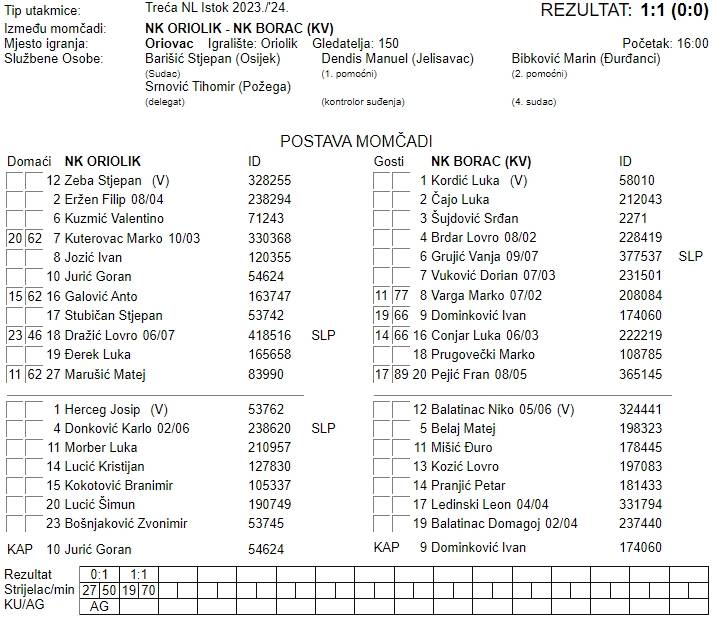 Derbi kao derbi, nije tu bilo pretjerano lepršavosti i nekakvih sjajnih akcija. Gosti su došli po bod u Oriovac, iskoristili su pomalo i umor kod domaćina i na kraju mogli i do sva tri s obzirom da su bili u vodstvu. Bolji je Oriolik bio u posjedu u prvom dijelu, no nije uspio puno toga kreirati pred Kordićem, a u nastavak Crveni kreću puno odlučnije, prvih pet minuta nastavka bila je prava opsada gostujućeg kaznenog prostora, imali su domaći 4-5 kornera u tom periodu, gol je visio u zraku, i došao je iz zraka. Iskusni Matej Marušić je visoko skočio i zakucao loptu “u 90”, samo je problem za domaće bio što je to učinio kod jednog od rijetkih izleta Borca na njihovu polovinu. Moramo i u ovom tekstu posvetiti rečenicu najboljem pojedincu utakmice s obzirom da se rijetko događa da ne usvojimo prijedlog trenera, bila je dilema između Đereka i Kordića, dakle Luka je u svakom slučaju. No kako je ipak nešto vrjedniji gostujući bod odlučili smo se za Kordića koji je odlično obavio svoj posao, a i u ovom opisu utakmice stigli smo do 62. minute kada je fantastično zaustavio pokušaj Galovića, napadač Oriolika ostao je sam poput duga na 5 metara od gostujućeg vratara, no Kordić se sjajno postavio i obranio njegov udarac. Ipak, u 70. minuti kao pobjednik izlazi onaj drugi Luka, Đerek koji je donio poravnanje i najavio nove juriše Oriolika ka gostujućem golu, no obrana na čelu s odličnim Lovrom Brdarom je sve izdržala. Posljednjih sedam minuta uključujući i sudački dodatak Oriolik je igrao s igračem manje nakon što je Kokotović zaradio drugi žuti, postoje glupi žuti kartoni, i postoje ovakvi kakvog je zaradio u 87. minuti koji spašavaju bod(ove). Uostalom, Kokotović je s terena ispraćen gotovo ovacijama s tribina zbog tog poteza, to i ne viđamo često, da nije napravio prekid na centru Borac bi imao matnu situaciju iz još jedne kontre. Ovako je završeno podjelom bodova, s obzirom na prikazano od gostiju oni moraju biti zadovoljni, nije to bilo na razini momčadi koja je na vrhu lige, dok i domaćin ne može biti nezadovoljan s obzirom na naporan tjedan koji su ostavili za sobom.