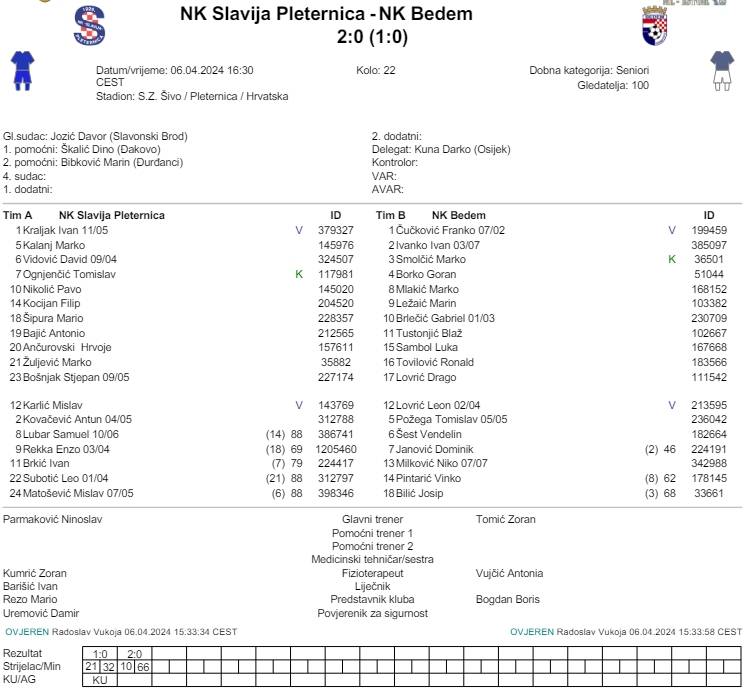 Velika tri boda osvojila je Slavija protiv Bedema, daleko je to od bodova spasa, ali da su sigurno bodovi koji donose optimizam u Pleternicu – jesu! S dvije vezane pobjede puno se lakše diše. Mirna utakmica ne pretjerano visokog ritma krenula je na domaću stranu u 32. minuti kada je Pavo Nikolić izborio, a Marko Žuljević realizirao kazneni udarac. Odmah nakon toga i prva prilika na utakmici, ubačaj s lijeve strane odlično je iskoristio Marin Ležaić, no njegov udarac sjajno brani mladi Ivan Kraljak. Bilo je to manje više to od prilika u prvom poluvremenu. Niti u nastavku nije bilo puno zanimljivije, pokušavali su gosti ali je domaća obrana otklanjala opasnosti na vrijeme ili je lovila goste u zaleđe. A onda u 66. minuti trenutak zbog kojeg je vrijedilo provesti 90 minuta uz teren, dobio je Pavo Nikolić jednu loptu u prostor, sustigla ga je gostujuća obrana, a on se namjestio na ljevicu i fantastično pogodio suprotnih “90”! Golčina! Kao i u prvom dijelu, odmah nakon gola velika prilika za Bedem, ponovno je u naslovnoj ulozi glava Marina Ležaića, ovoga puta ne i domaći vratar, najbolji strijelac Bedema nije uspio pogoditi okvir gola sa 6-7 metara. Parmaković je zatvorio sve prilaze svom golu, sačuvao mrežu netaknutom i osvojio velike bodove. Gosti su nakon utakmice bili prilično nezadovoljni suđenjem, u nekim trenucima su čak od suca tražili i da svira kraj desetak minuta prije isteka devedesete, a službeno su najavili i prigovor na današnju arbitražu.