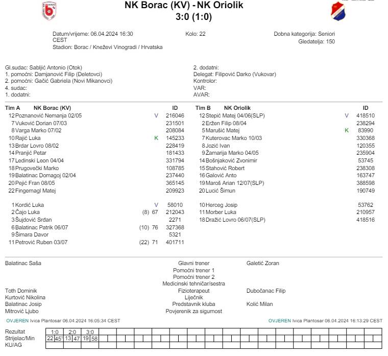 Borac je još jednom pokazao kako je prava domaćinska momčad, iz Baranje se teško odnose bodovi pa to nije za rukom pošlo ni Orioliku koji nakon ovog poraza definitivno može računati da će se do kraja boriti za goli trećeligaški život. 12 minuta igre na prijelazu iz prvog u drugo poluvrijeme bilo je kobno za Oriolik, u prvoj minuti sudačkog dodatka prvog poluvremena Matej Fingernagl je donio vodstvo Borcu, u drugoj minuti drugog dijela Lovro Brdar je zabio drugi i praktično odlučio pobjednika, a točku na i u 58. stavlja Domagoj Balatinac.