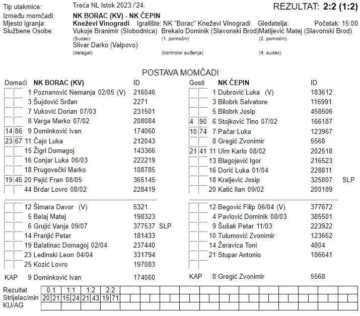 Nisu zaustavljene serije Naška i Kutjeva nego i velika pobjednička serija Borca na domaćem terenu. Nevjerojatno djeluje ono što Čepin igra ove sezone, puno prosutih bodova na domaćem, ali jako dobre prezentacije na gostovanjima puno toga pokriju i popravljaju dojam. Poveli su gosti u 21. preko Ilana Katića, ekspresno su se domaći vratili tri minute kasnije golom Domagoja Žigrija, a na odmor ipak Čepin odlazi s minimalnom prednosti za što se u završnici pobrinuo Antonio Stupar. Dugo je odolijevao Čepin a onda u 68. ostaju s igračem manje nakon drugog žutog Zvonimira Gregića, a kako još jednog Domagoja za spašavanje i vraćanje iz minusa ima Borac, mladi Domagoj Balatinac još je jednom zorno pokazao da je riječ o iznimnom talentu, u 71. minuti zabio je za konačnih 2:2 i barem ostavio svoju momčad bez domaćeg poraza.