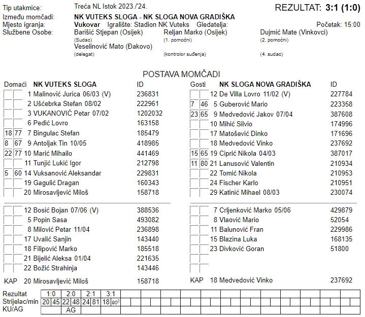 Vuteks je “potvrdio” bodove iz Čepina, Karakaš je očigledno posložio kockice u Vukovaru i Vuteks sada djeluje dobro, kompetetivno i sigurno ide prema sredini ljestvice. Poveli su domaći pred sam odlazak na odmor golom Miloša Mirosavljevića, a najbolji mogući start u nastavak i povećanje prednosti autogolom im je donio Nikola Tomić. Nadu Slogi da može do novog gostujućeg remija u 81. minuti vraća Karlo Fischer, no ništa od toga, pobjedu Vuteksa ovjerio je Marko Filipović početkom sudačkog dodatka.