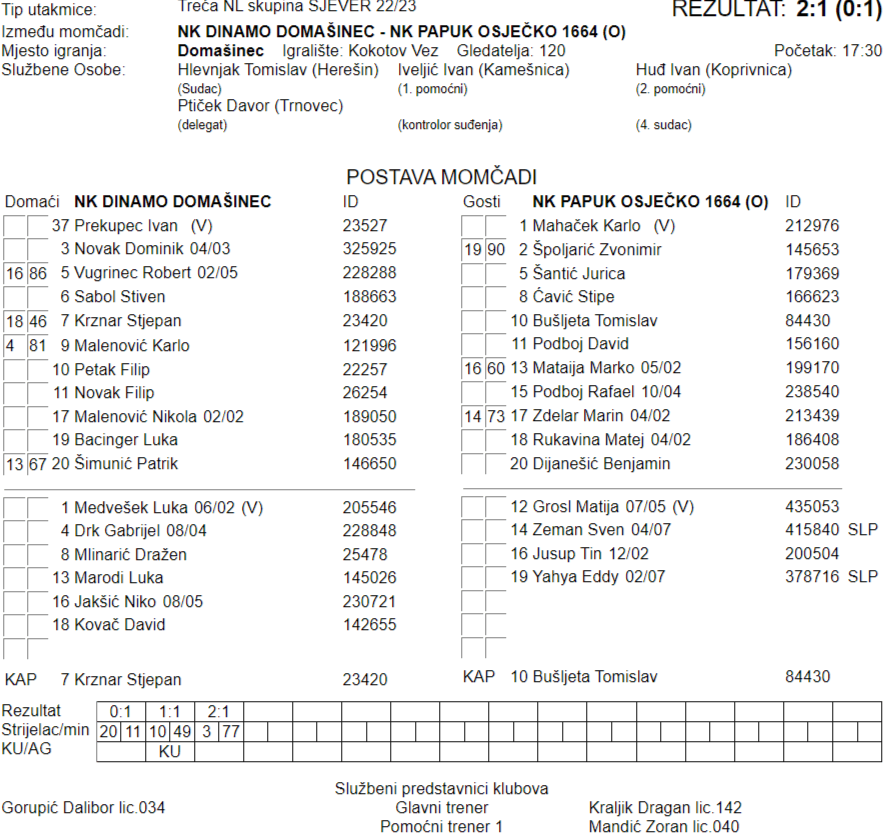 | 25 | 20.05.2023 17:30 | Domašinec | NK Dinamo Domašinec – NK Papuk Osječko 1664 (O) | 2:1 | |