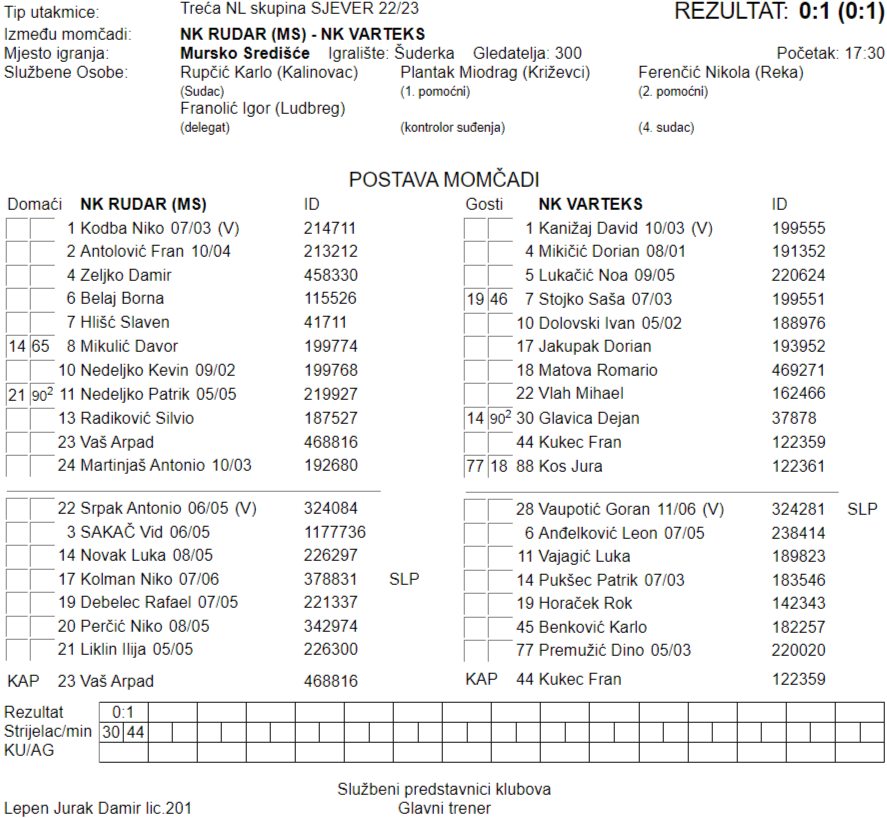 | 20.05.2023 17:30 | Mursko Središće | NK Rudar (MS) – NK Varteks | 0:1 | ||