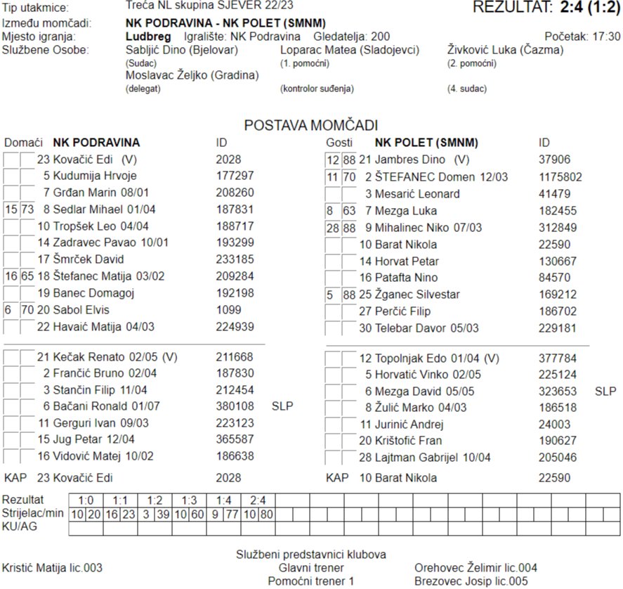 | 25 | 20.05.2023 17:30 | Ludbreg | NK Podravina – NK Polet (SMnM) | 2:4 | |
