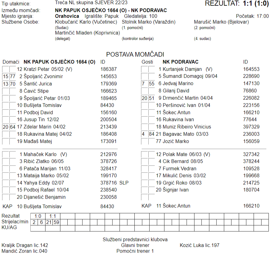| 22 | 29.04.2023 17:00 | Orahovica | NK Papuk Osječko 1664 (O) – NK Podravac | 1:1 | |