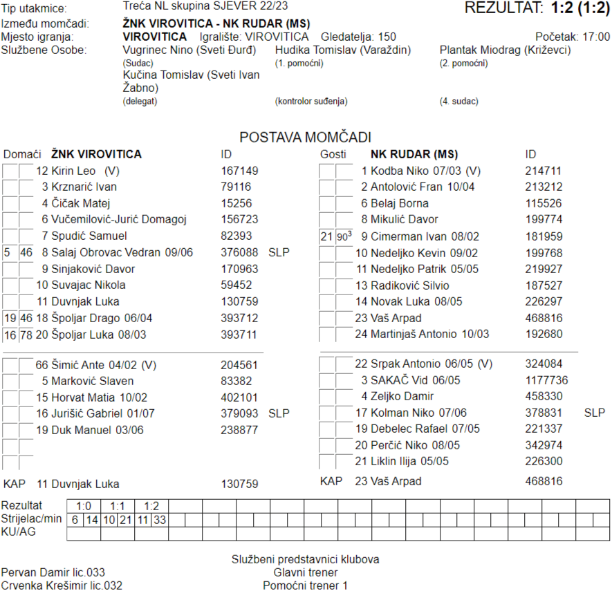 | 29.04.2023 17:00 | VIROVITICA | ŽNK Virovitica – NK Rudar (MS) | 1:2 | ||