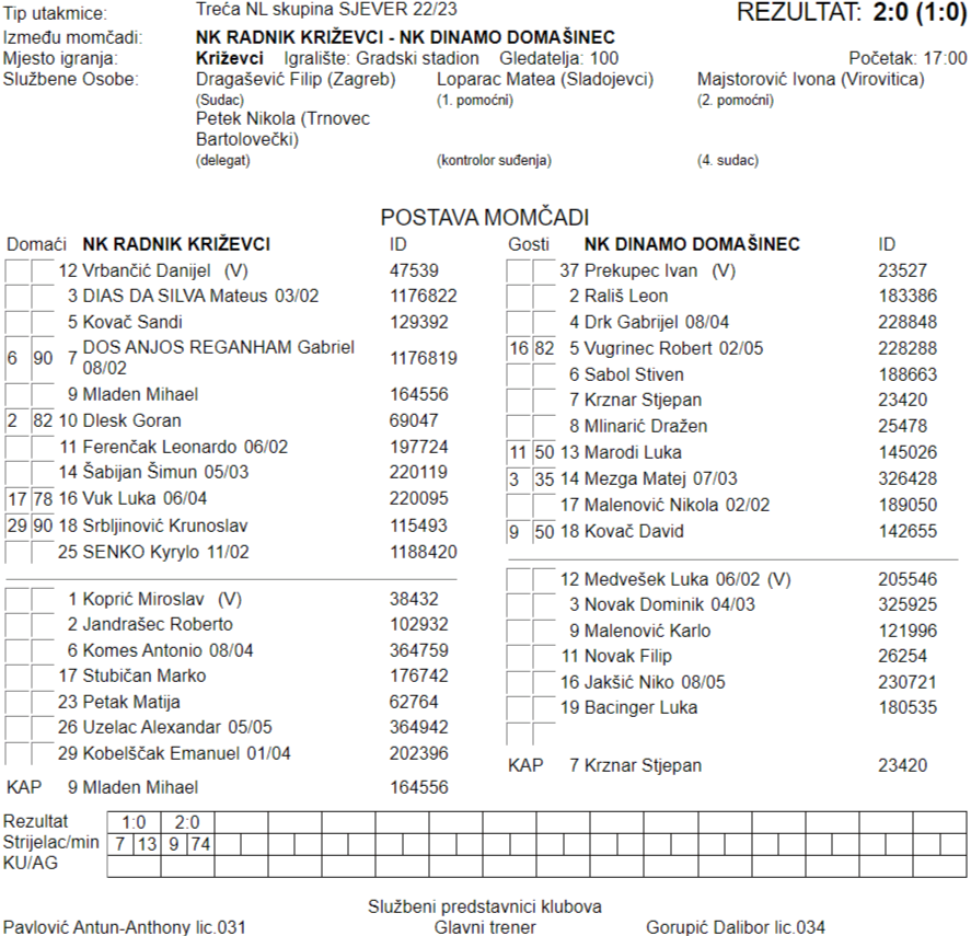 | 22 | 29.04.2023 17:00 | Križevci | NK Radnik Križevci – NK Dinamo Domašinec | 2:0 | |