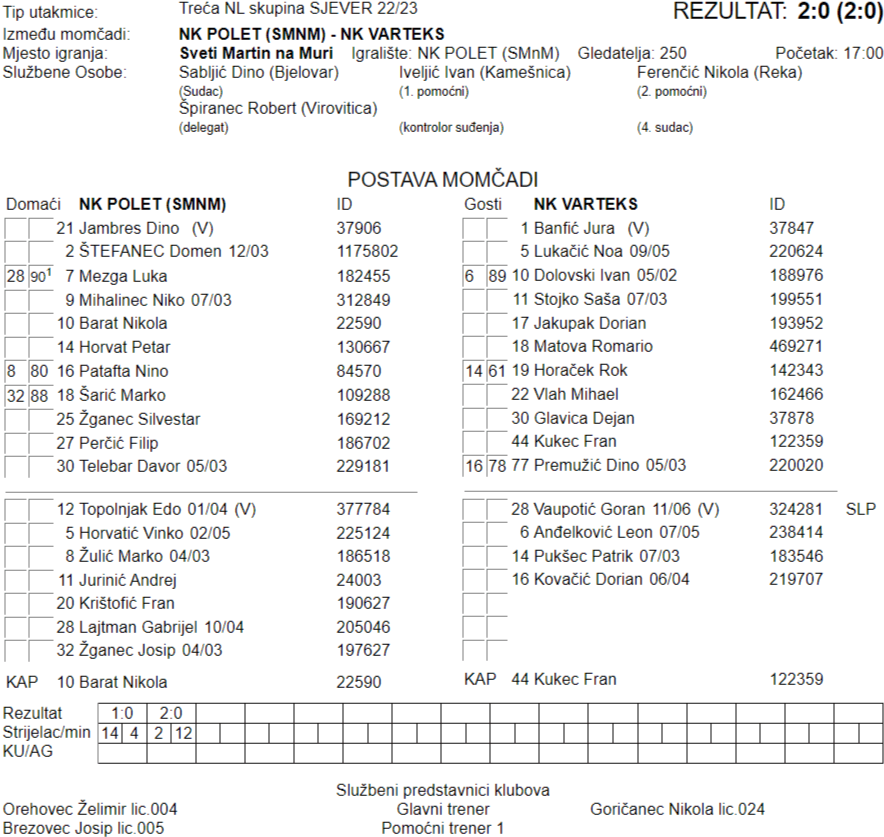 | 22 | 29.04.2023 17:00 | Sveti Martin na Muri | NK Polet (SMnM) – NK Varteks | 2:0 |