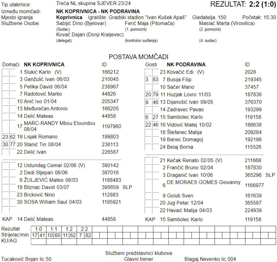 9 | 14.10.2023 15:30 | Koprivnica | NK Koprivnica – NK Podravina | 2:2 | |