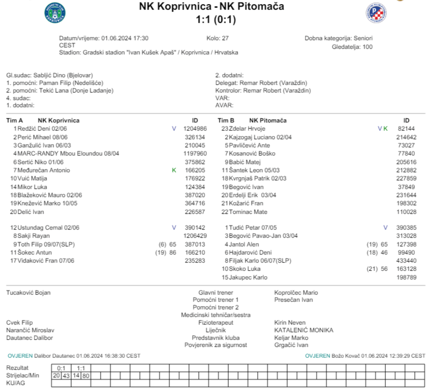 | 27 | 01.06.2024 17:30 | Koprivnica | NK Koprivnica – NK Pitomača | 1:1 | |
