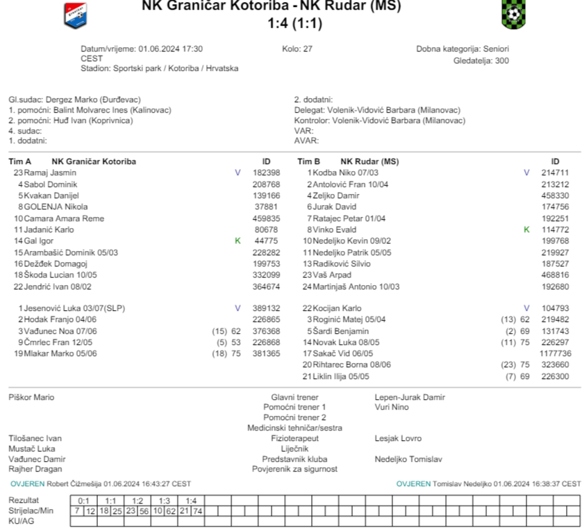 | 27 | 01.06.2024 17:30 | Kotoriba | NK Graničar Kotoriba – NK Rudar (MS) | 1:4 | |