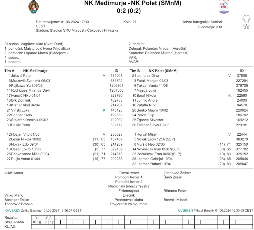 | 01.06.2024 17:30 | Čakovec | NK Međimurje – NK Polet (SMnM) | 0:2 |