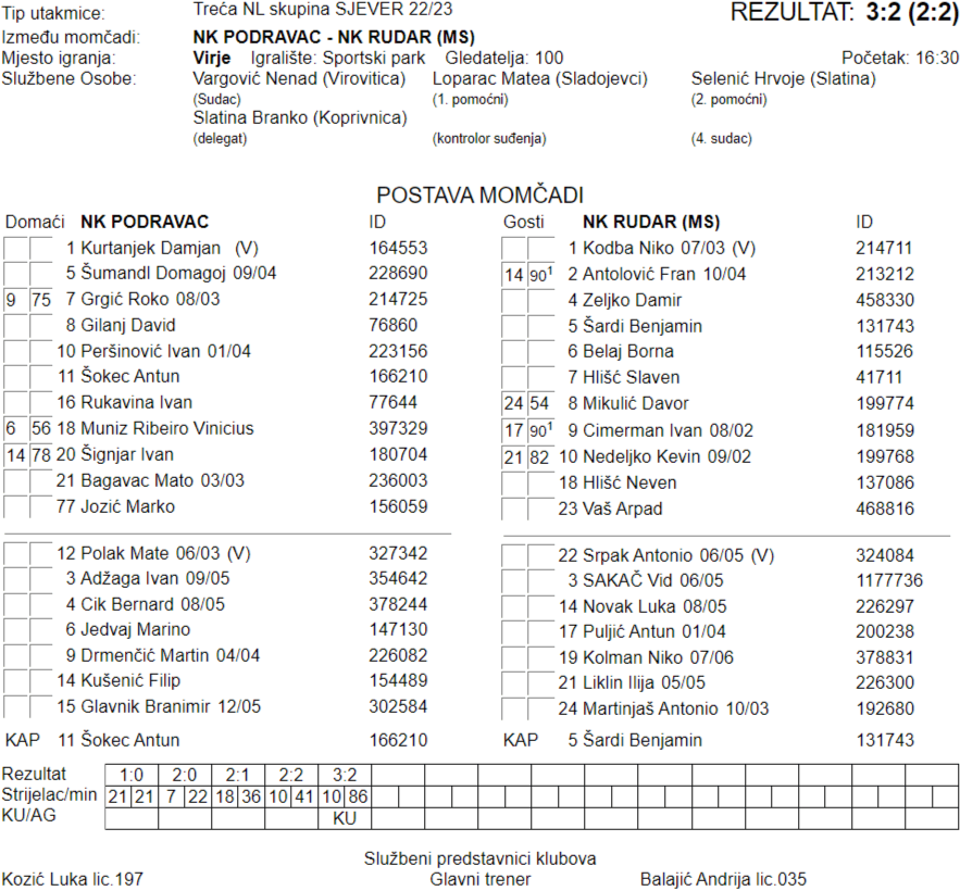 | 15.04.2023 16:30 | Virje | NK Podravac – NK Rudar (MS) | 3:2 | ||