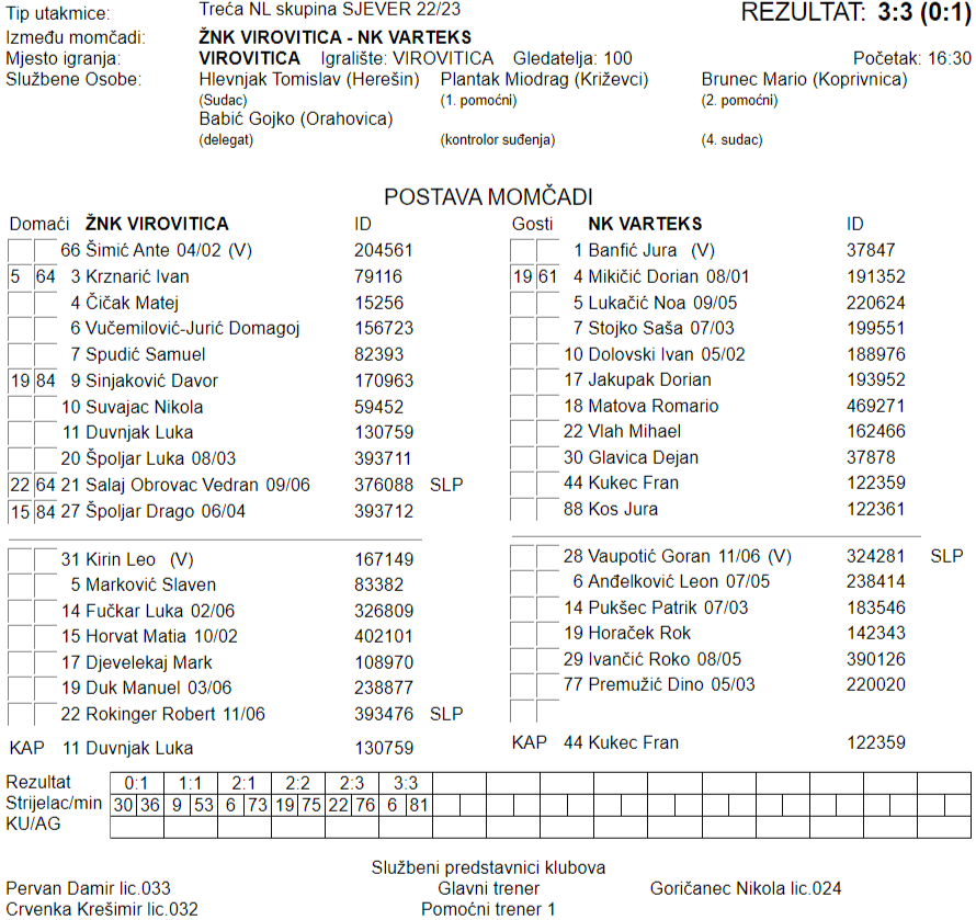 | 15.04.2023 16:30 | VIROVITICA | ŽNK Virovitica – NK Varteks | 3:3 | ||