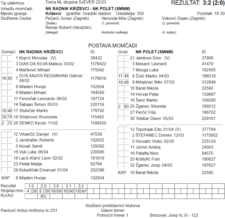 | 20 | 15.04.2023 16:30 | Križevci | NK Radnik Križevci – NK Polet (SMnM) | 3:2 |