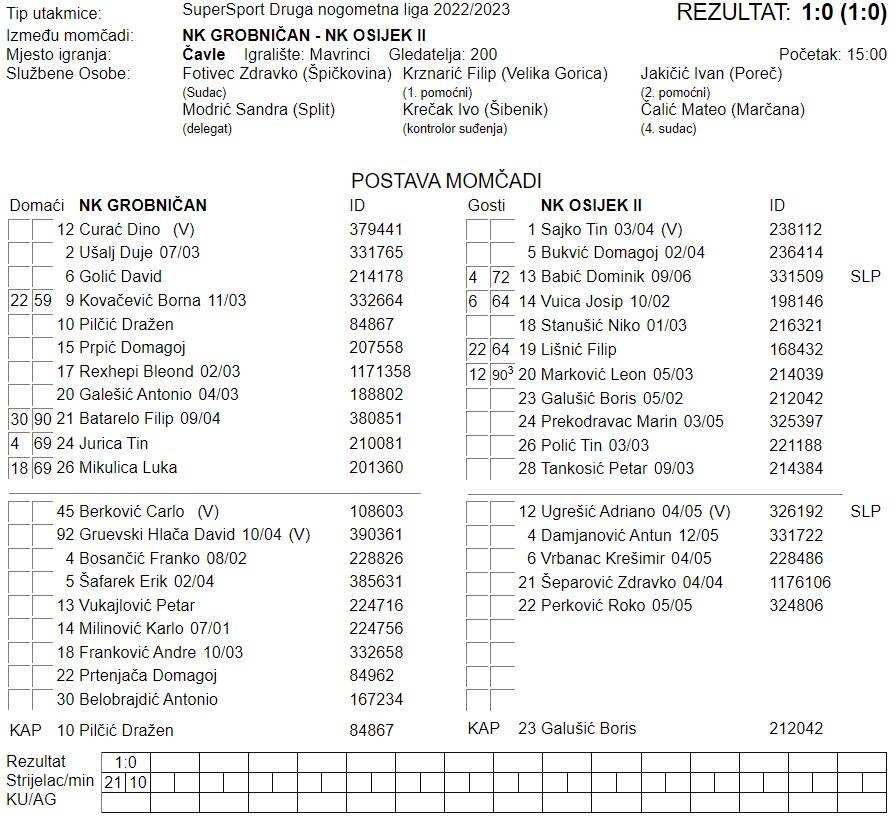 Velika pobjeda za momčad Predraga Stilinovića, pobjeda kojom su skinuli tonu tereta s leđa i sada doista imaju bitno ugodniju situaciju kad je borba za ostanak u pitanju. Mogli su Osječani do vodstva u otvaranju ali im se na tom putu ispriječila vratnica, no brzo je vodstvo otišlo na domaću stranu, već u desetoj minuti. Po desnoj strani probio je Rexepi, povratnom tražio Galešića od kojeg lopta skreće prema Filipu Batarelu koji mirno poput kakvog rutinera sprema loptu u mrežu za vodstvo Grobničana.