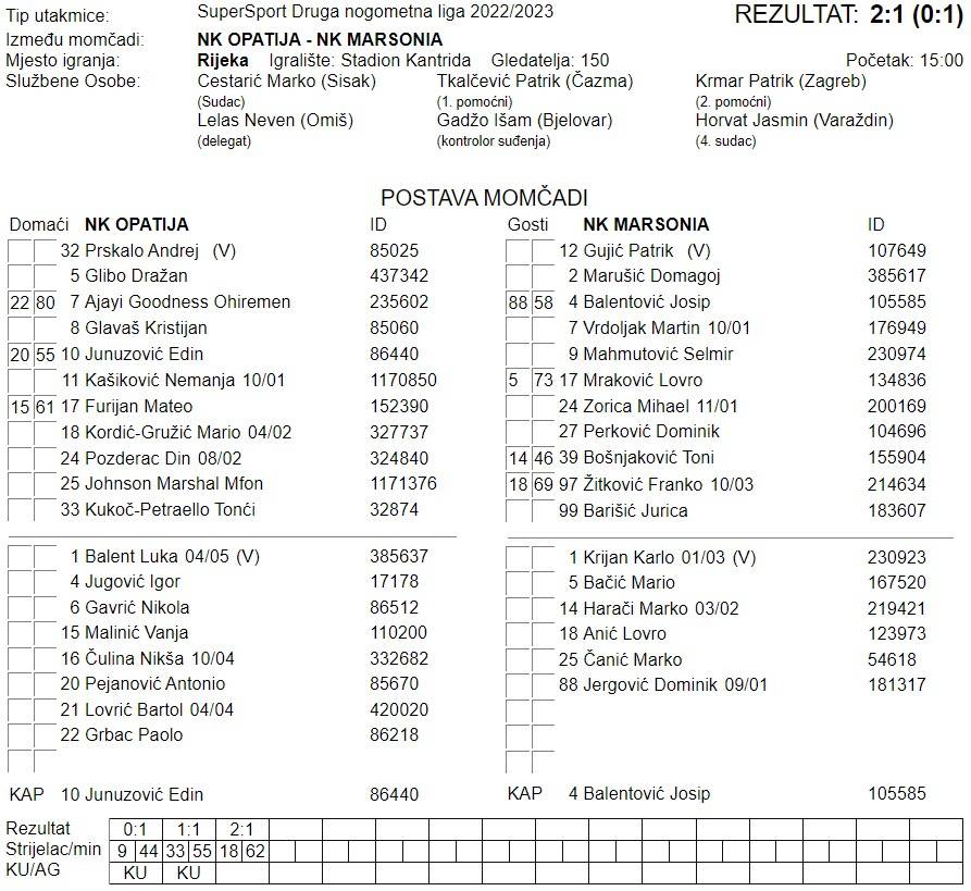 Opatija je opravdala ulogu favorita i osvojila domaće bodove protiv Marsonije, ali je to bilo sve samo ne lako jer su se Brođani predstavili kao dobra ekipa. Pravu nisku dobrih prilika su domaći zapucali u prvom poluvremenu, a onda u samoj završnici prvog poluvremena Marsonia je povela golom Selmira Mahmutovića s bijele točke, a taj kazneni udarac se nije nimalo svidio domaćima koji su žestoko protestirali u čemu je na klupi isključenje zaradio Jugović. Početak nastavka pripao je Marsoniji koja je izgledala bolje na terenu, no sada je Ajayi izborio kazneni udarac kojeg u poravnanje pretvara Tonći Kukoč. Mogla je gostujuća momčad do novog vodstva, no Mahmutović sa 5-6 metara umjesto mreže gađa gredu. Kazna je stigla vrlo brzo, sjajan prodor Mario Kordić Gružić okončava preciznim udarcem s ruba kaznenog prostora. Opatija je uglavnom dobro iskontrolirala utakmicu do kraja, no u 82. minuti je Harači imao dobru šansu za poravnanje no zahvaljujući dobroj reakciji obrane i ona je otišla u nepovrat.