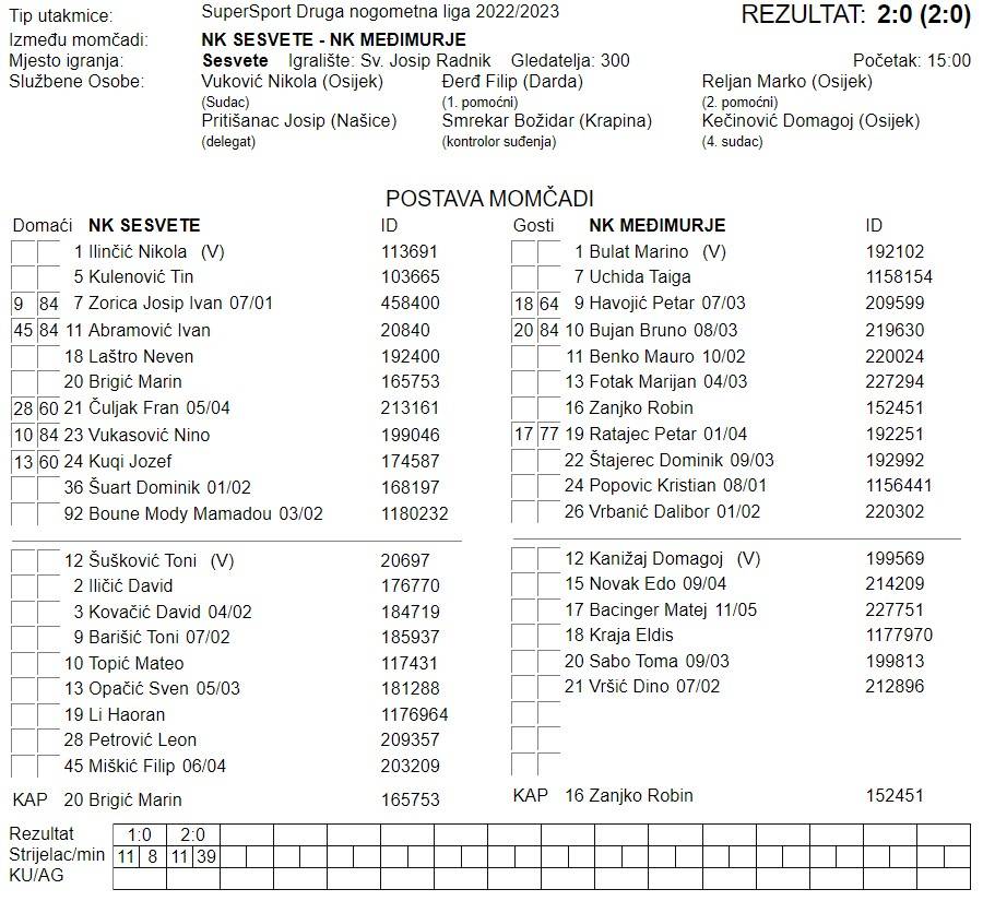 Sesvete su sigurno došle do prve proljetne pobjede te tako, barem privremeno, smanjile zaostatak za vodećim Jadranom na samo -1. Otvaranje kao po željama Rajka Vidovića, akcija se odvijala po desnom boku, ubačaj na rub peterca gdje najbolje reagira Ivan Abramović i domaćin je “otključao” goste. Međimurje se dobro branilo, čak i lijepo kombiniralo do zadnje trećine u kojoj više nisu mogli raditi probleme iskusnijem i kvalitetnijem domaćinu. Priča je zaključena u završnici prvog poluvremena, nakon što je Abramović zabio fantastičan gol s ruba kaznenog prostora bilo je jasno da bodovi ostaju u Sesvetama.