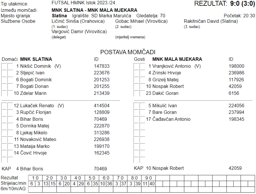 1/2F | 07.10.2023 20:30 | Slatina | MNK Slatina – MNK Mala Mjekara | 9:0 |