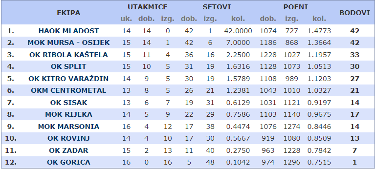 Odbojkaši Murse jadransku turneju započeli su u ”najsportskijem gradu na svitu”. U prva dva seta utakmica je bila jednosmjerna ulica. Osječki odbojkaši nisu dozvolili Splićanima da se razigraju i prilično lagano došli do vodstva 0:2 u setovima. U trećem setu Splićani se bude i otvaraju set vodstvom 9:4. Nakon toga Osječani postepeno smanjuju zaostatak, ali se serijom servisa bivšeg igrača Murse Jurice Šućura Splićani ponovno vraćaju na pet poena prednosti 22:17. Kada se činilo da će utakmica otići u četvrti set, nekoliko pogrešaka domaćina, želja osječkih odbojkaša da sve završe u tri seta i jedna sporna odluka suca dovode do završetka seta 23:25 u korist Murse, a time i utakmice u splitskoj dvorani Poljud. Nakon te utakmice još je slijedilo gostovanje u Rijeci u zaostaloj utakmici 13.kola. Iako su Mursaši bili izraziti favoriti u ovom susretu, teško je bilo očekivati jednako autoritativnu predstavu od izabranika Marija Tepperta zbog umora od putovanje i teških nogu. No, od početka su se Osječani postavili kao favoriti na parketu te su u vrlo sigurna 3 seta upisali nova 3 boda koja ih i dalje drže odmah iza zagrebačke Mladosti na prvenstvenoj ljestvici.