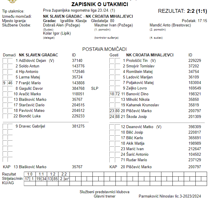 NK SLAVEN GRADAC – NK CROATIA MIHALJEVCI 2:2