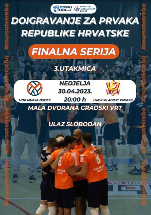 Večeras se u maloj dvorani Gradskog vrta zaista piše povijest kako osječkog tako i hrvatskog sporta! Odbojkaši Murse igraju treću utakmicu finala doigravanja protiv zagrebačke Mladosti, u nju ulaze s vodstvom 2:0 i ako dođu do pobjede postat će prvaci Hrvatske!