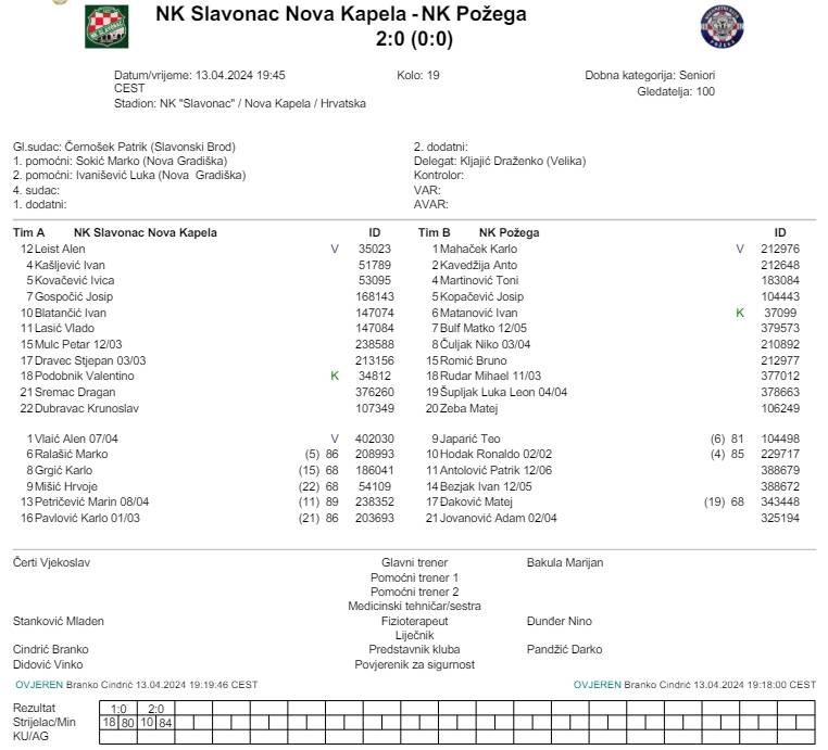 Slavonac je uspio i stvarno upisati one unaprijed upisane bodove koji često izmaknu favoritima iz ruku. Požega se u Kapeli predstavila u vrlo lijepom izdanju, u prvom su poluvremenu neutralizirali domaćina, u drugom se igra nešto rasplamsala, imali su i gosti svoje šanse koje nisu iskoristili, domaćin svoje je preko Valentina Podobnika i Ivana Blatančića i na kraju sasvim zasluženo piše tri nova boda i postaje prvi pratitelj zahuktalom Vinogorcu.