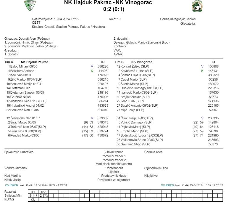 Važnu pobjedu na putu do naslova prvaka upisao je Vinogorac u Pakracu. Mlada domaća momčad imala je svoje prilike koje nije uspjela iskoristiti, gosti su to kaznili najprije s bijele točke, kazneni udarac je u vodstvo u 16. minuti pretvorio Mateo Škorić. Odluka o pobjedniku pala je u 72. kada je put do mreže mladog Mihaela Baloga pronašao Lukas Kovačević. Hajduk bez Matijaševića očigledno ne može pratiti Vinogorac, borba za naslov nije izgubljena, ali su i Vinogorac i Kapela sada u ozbiljnoj prednosti.